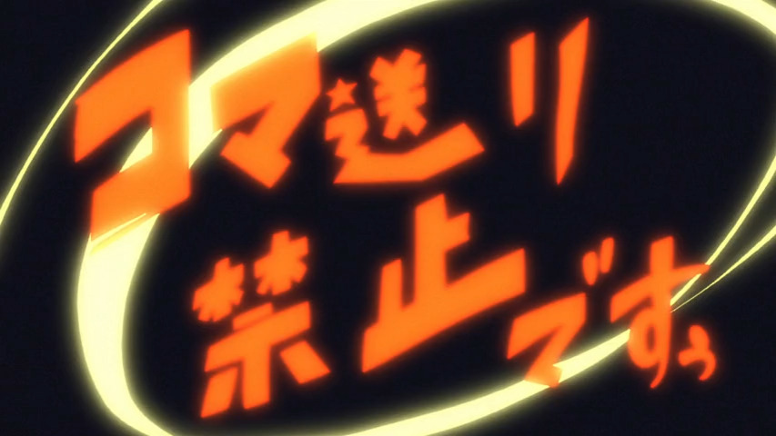 Yoshihara, bien conscient que sa série sera vu par des fans d’animation minutieux du moindre détail, se permet même de nous faire une attaque directe sur l’épisode 8. En tant que superviseur de l’animation de l’épisode, il y ajoute une impact frame sur 2 images indiquant « Frame par frame interdit !! » (コマ送り禁止!!), en référence à une impact frame similaire qu’il a probablement incrustée lui-même sur l’épisode 6 de Detective Opera Milky Holmes, aussi en tant que superviseur de l’animation.